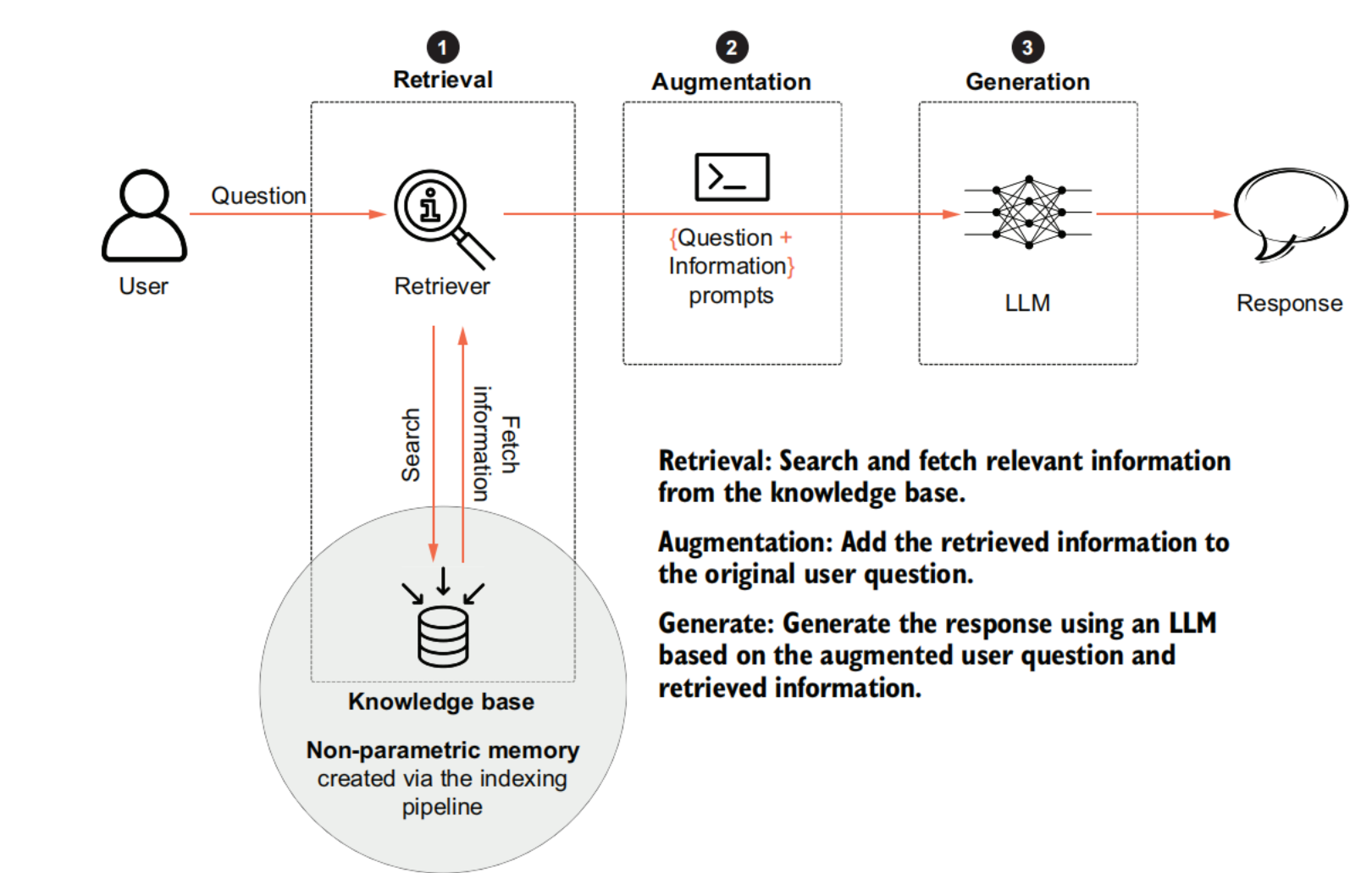 - Augmentation combines the user query with retrieved information to create a prompt for the LLM.