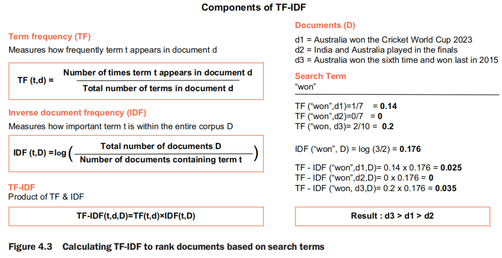 TF-IDF not only can be used for unigrams, but also for phrases (n-grams). However, even TF-IDF improves on simpler search methods by emphasizing unique words, it still lacks context and word-order consideration, making it less suitable for complex tasks like RAG.
