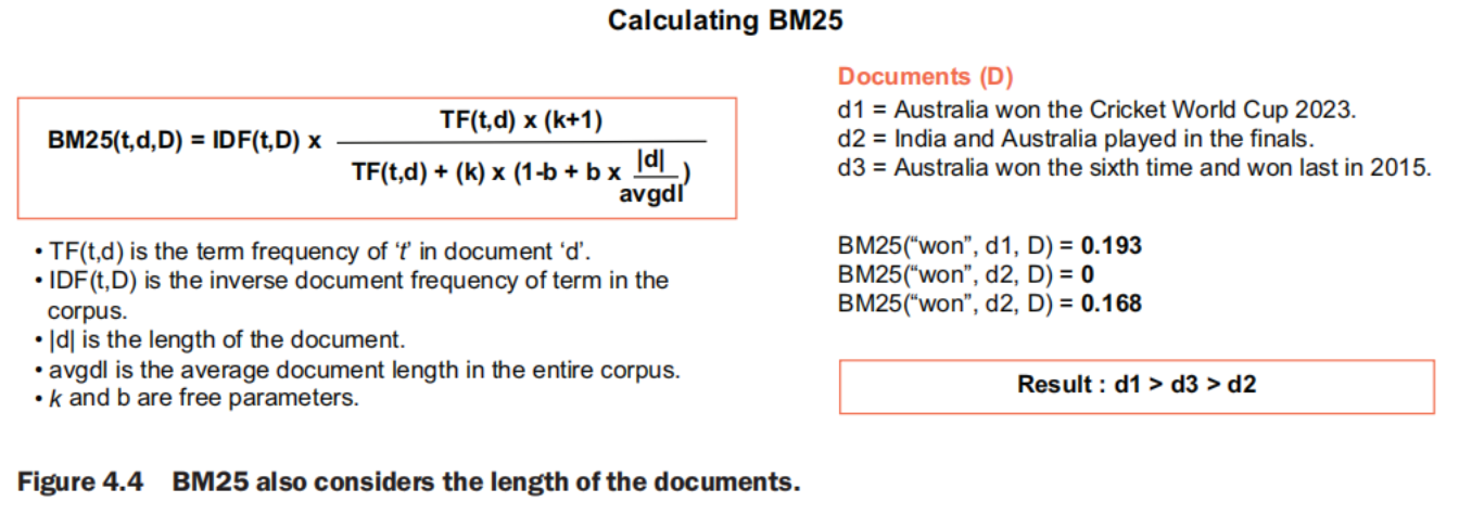 For long queries instead of single keywords, the BM25 value is calculated for each word in the query, and the final BM25 value for the query is a summation of the values for all the words. BM25 is a powerful tool in traditional IR, but it still doesn’t capture the full semantic meaning of queries and documents required for RAG applications. BM25 is generally used in RAG for quick initial retrieval, and then a more powerful retriever is used to re-rank the results.