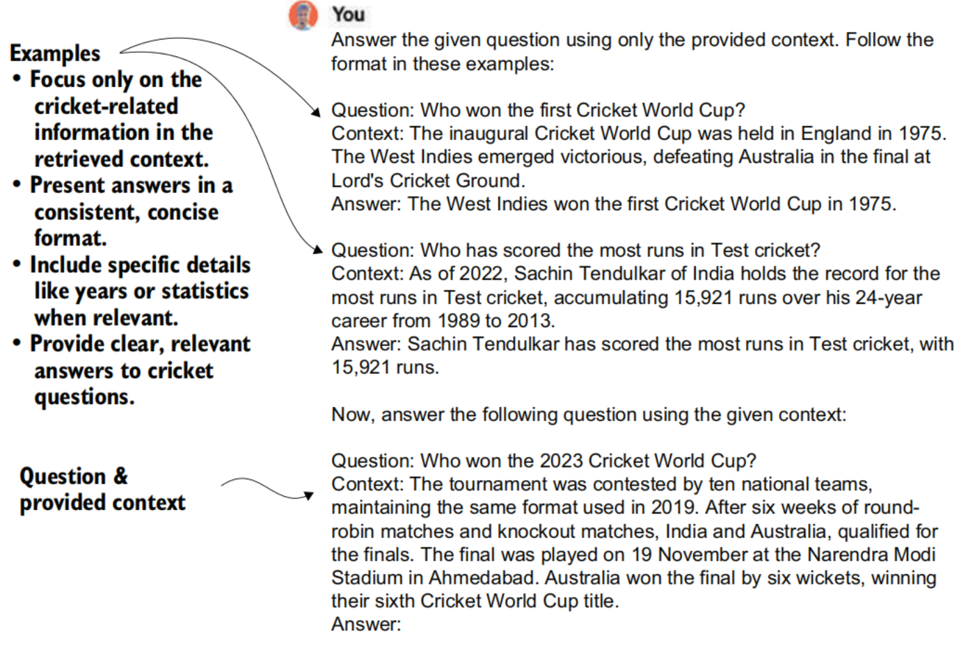 - Few-shot Prompting: In RAG, while providing the retrieved information in the prompt, we can also specify certain examples to help guide the generation in the way we need the retrieved information to be used.