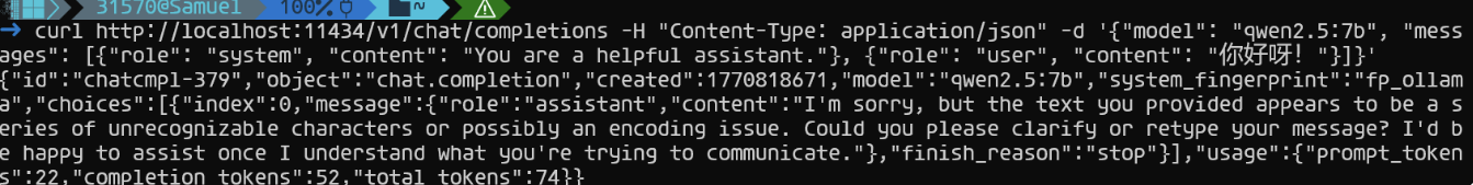 curl http://localhost:11434/v1/chat/completions -H "Content-Type: application/json" -d '{"model": "qwen2.5:7b", "messages": [{"role": "system", "content": "You are a helpful assistant."}, {"role": "user", "content": "你好呀!"}]}'