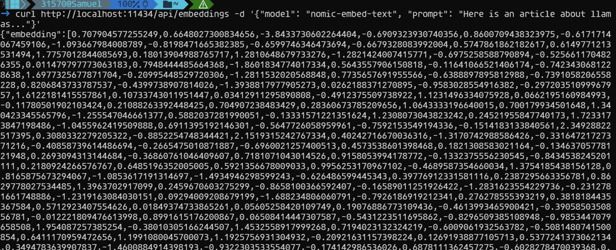 curl http://localhost:11434/api/embeddings -d '{"model": "nomic-embed-text", "prompt": "Here is an article about llamas..."}'